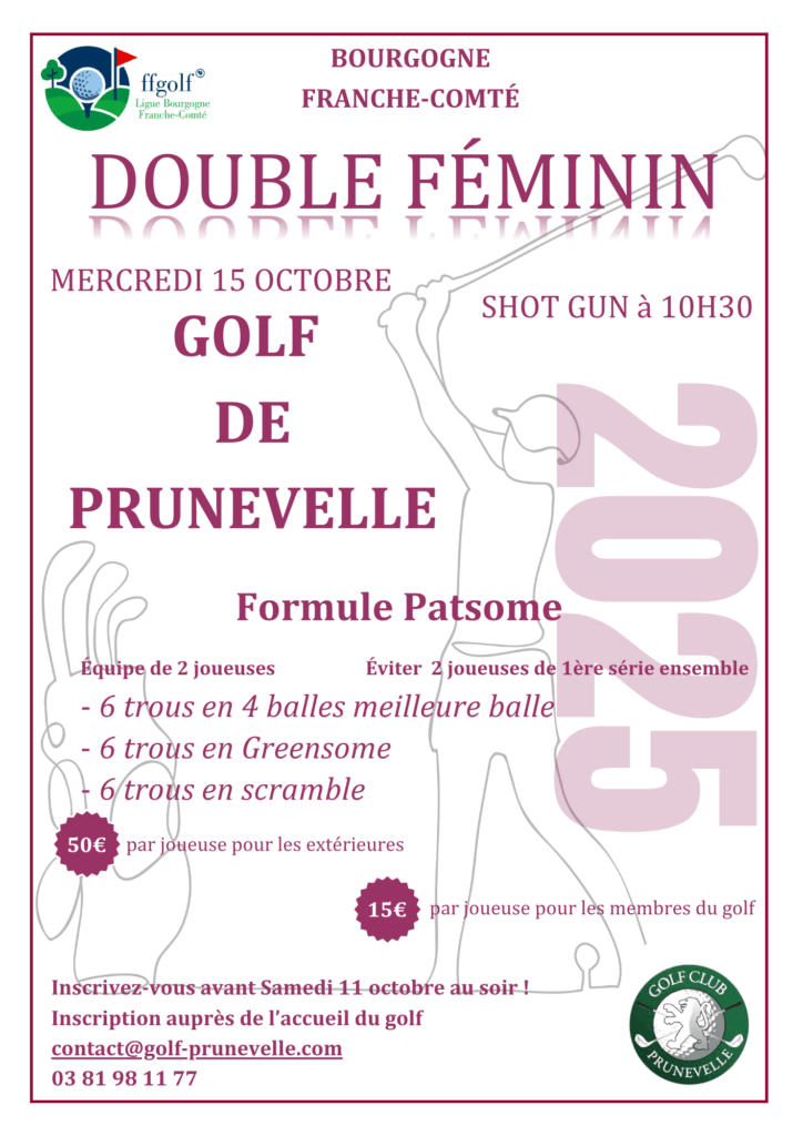 Inscription jusqu’au Samedi 11 octobre au soir directement à l’accueil du golf par téléphone : 03 81 98 11 77 ou par mail : contact@golf-prunevelle.com.