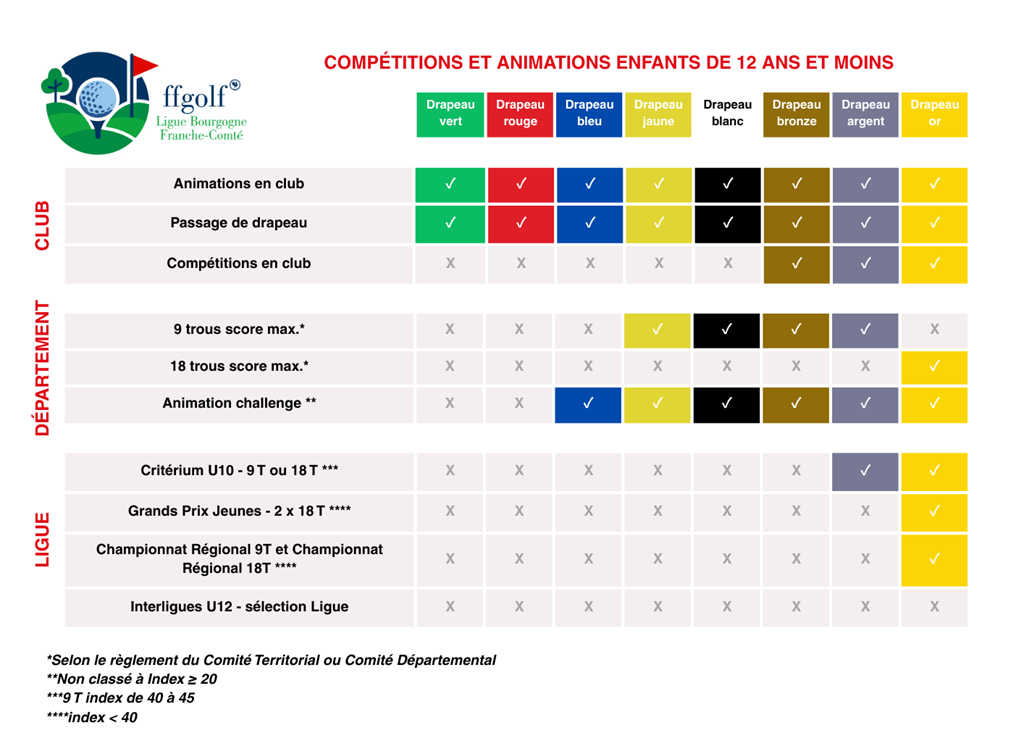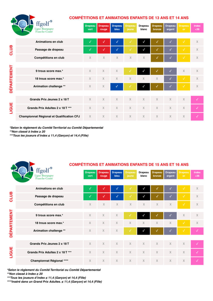 La Fédération propose l’homologation de parcours appelés « repères jeunes » dont les distances sur chaque trou, sont adaptées à l’âge des jeunes jusqu’à 16 ans. Ces parcours sont composés à partir des départs traditionnels (rouges, bleus, jaunes, blancs, noirs), auxquels sont rajoutés les départs avancés (violets et oranges), afin d’obtenir des distances adaptées pour le passage des Drapeaux et pour les jeunes filles jusqu’à U12.